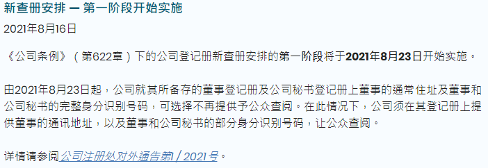 据香港公司注册处8月16日消息,《公司条例》(第622章)下的公司登记册新查册安排的第一阶段将于2021年8月23日开始实施。